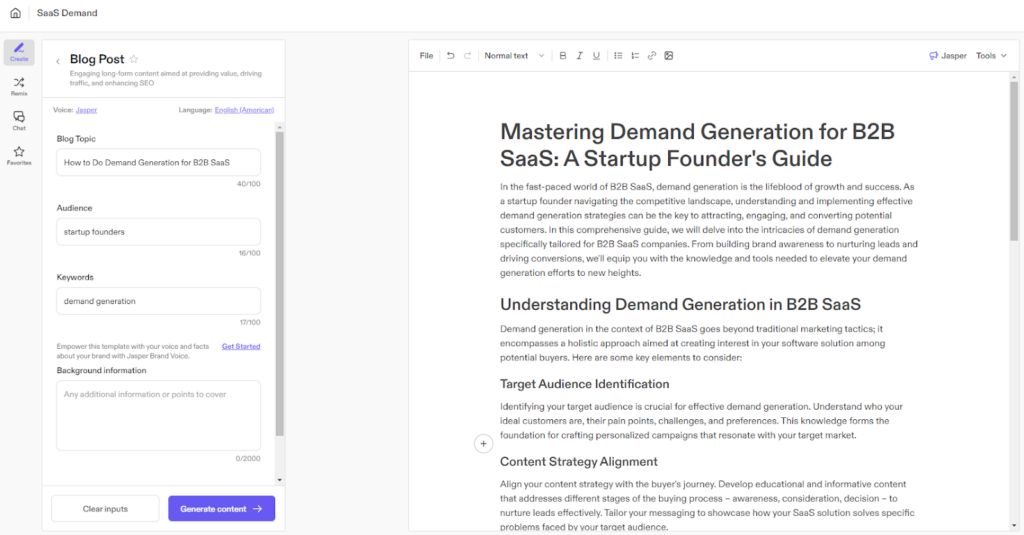 How it works: Use Jasper’s blog post workflow templates. Try the “Content Improver” feature to refine topic ideas. Base refinements on your target keywords and audience.