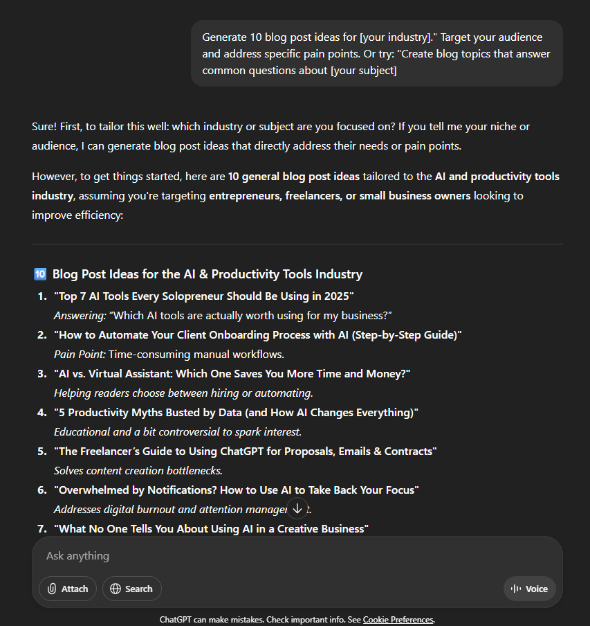 How it works: Use specific prompts like this: “Generate 10 blog post ideas for [your industry].” Target your audience and address specific pain points. Or try: “Create blog topics that answer common questions about [your subject].”