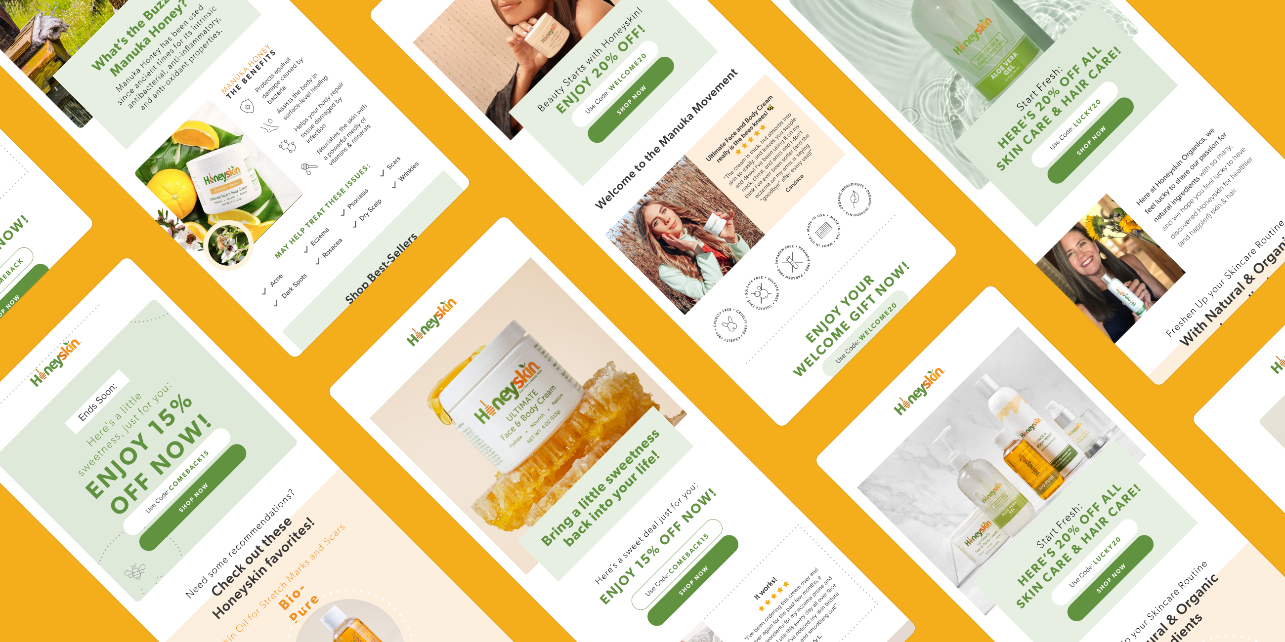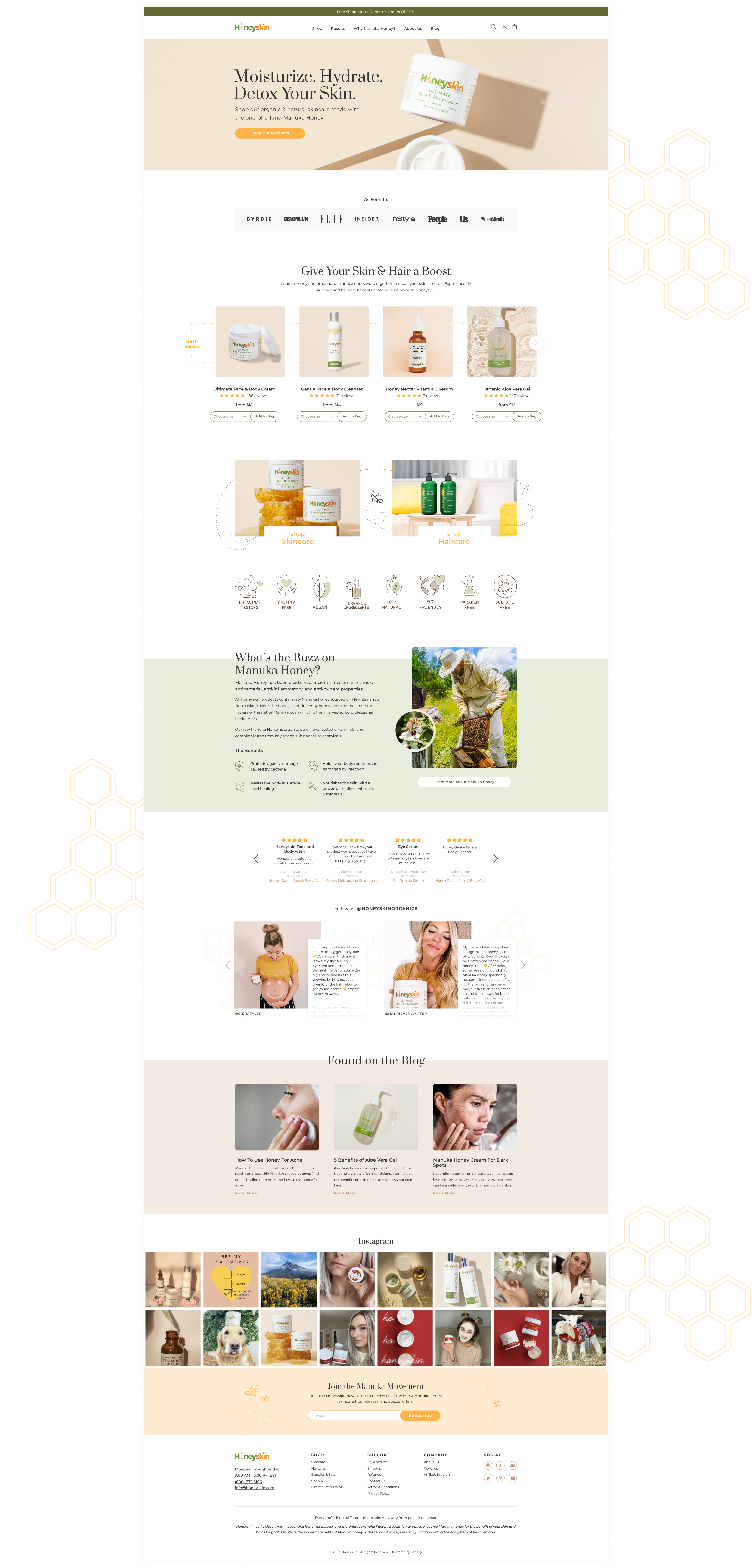 We had a holistic approach when it came to updating Honeyskin’s website. We started with a discovery session: reviewing the ins and outs of their current website and learning more about their competitors. From there we took the time to carefully review the brand assets they had built over the years, ensuring our new designs would elevate and complement what they had already.