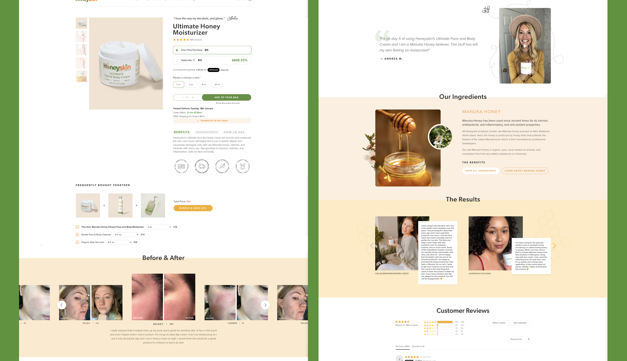 Armed with all the details, the new site was built with all the bells and whistles necessary to make Honeyskin competitive in today’s market. Built on Shopify, we created an intuitive user experience with quick load times, while also adding important CRO capabilities to their product pages. We integrated modern functionalities like live chat, customer loyalty and referral programs, along with customer reviews, subscriptions, a blog and user-generated content (to name a few).