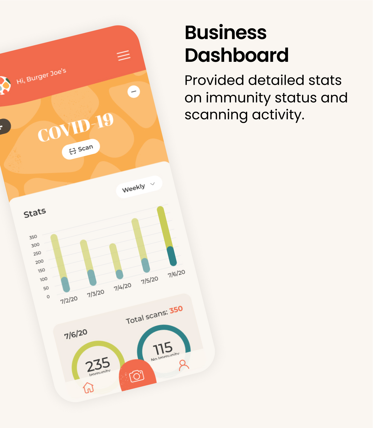 For businesses, the premium subscription on the app allowed tracking of immunity status across employees and customers, providing detailed statistics on the number of individuals’ immunity records. Business owners could also scan others’ QR codes and view data for specific time frames—daily, weekly, or monthly—offering insights into immunity trends and overall scanning activity.