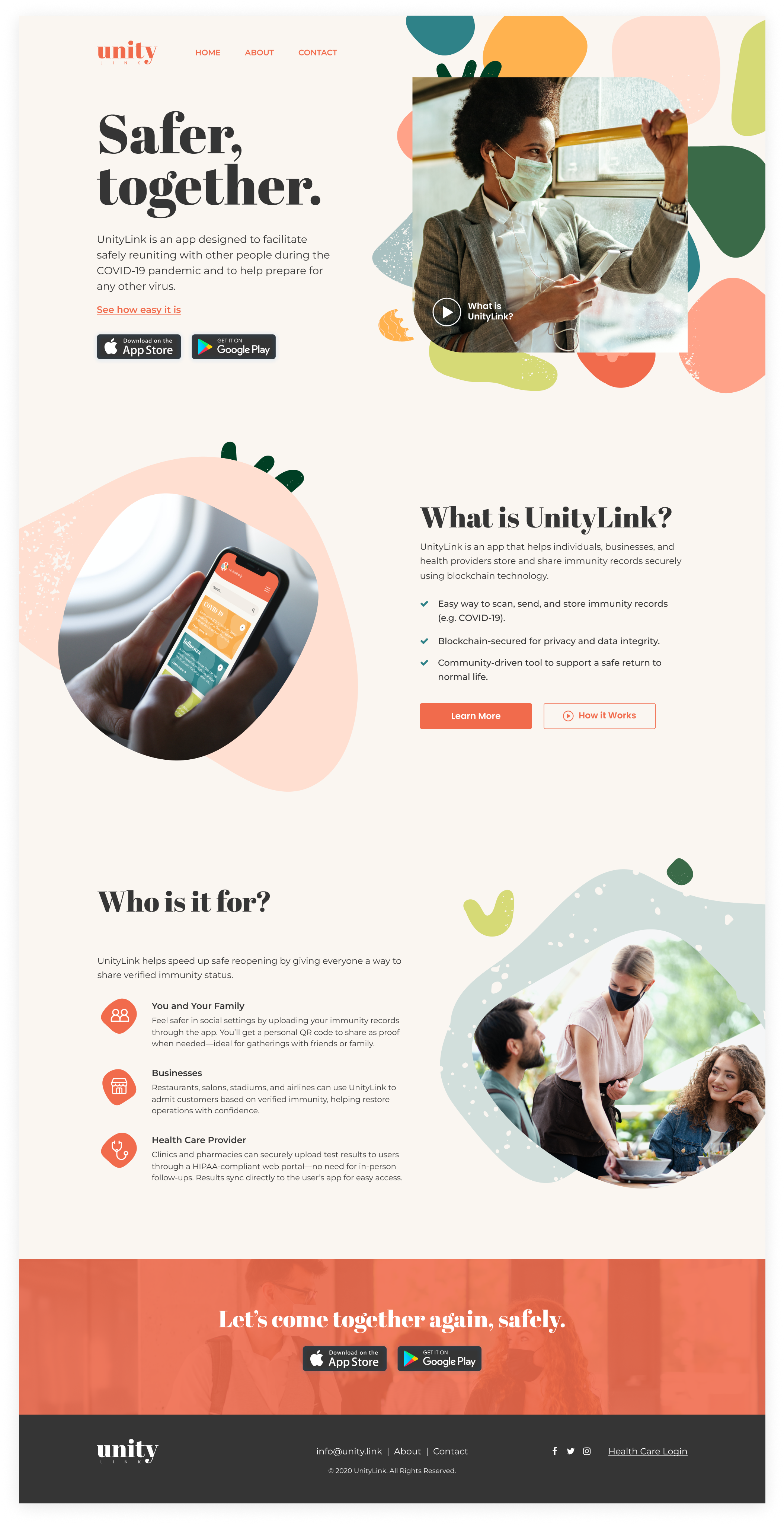 Newbird assisted UnityLink with defining its brand identity from the ground up. This included developing a name that captured the app’s mission—empowering users through virus test results and vaccination records. We also created a logo and visual branding elements that reflected the app’s secure, professional, and healthcare-focused nature. The result was a strong, recognizable brand that aligned perfectly with UnityLink’s mission to help businesses, healthcare providers, and individuals navigate the pandemic with confidence.